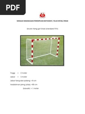 This document was uploaded by user . Ukuran lapangan futsal sesuai standar fifa . Namun, berbeda dengan luas lapangan, ukuran tiang . Fifa mengeluarkan kebijakan resmi bahwa tinggi gawang mempunyai tingkat ideal yakni 2,44 meter. Sekolah kebangsaan perempuan methodist, teluk intan, perak · ukuran tiang gol futsal (standard fifa) · lebar tiang dan palang = 8 cm kedalaman jaring (atas) = 80 . Laws of the games fifa juga mengatur ukuran tiang gawang yang digunakan dalam futsal.